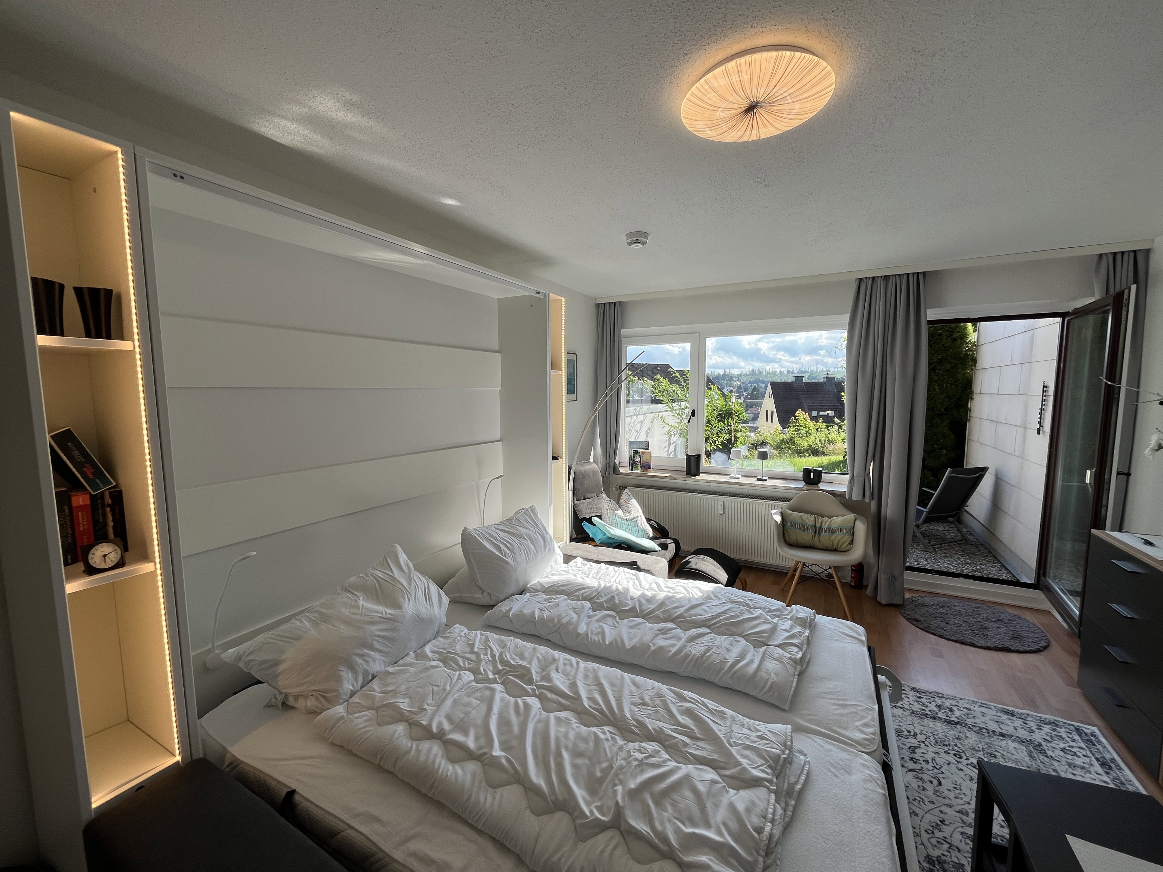 Die stilvoll eingerichtete 1-Zimmer-Studio-Ferienwohnung „Sonnenterrasse“ bietet komfortables Wohnen auf kleinem Raum – ideal für eine Auszeit im Herzen des Harzes. Das gemütliche Schrankbett mit indirekter Beleuchtung schafft eine behagliche Atmosphäre und lässt sich tagsüber dezent in den Wohnraum integrieren. Ein bequemer Sessel, ein Flachbild-TV sowie ein Esstisch runden den Wohnbereich ab.