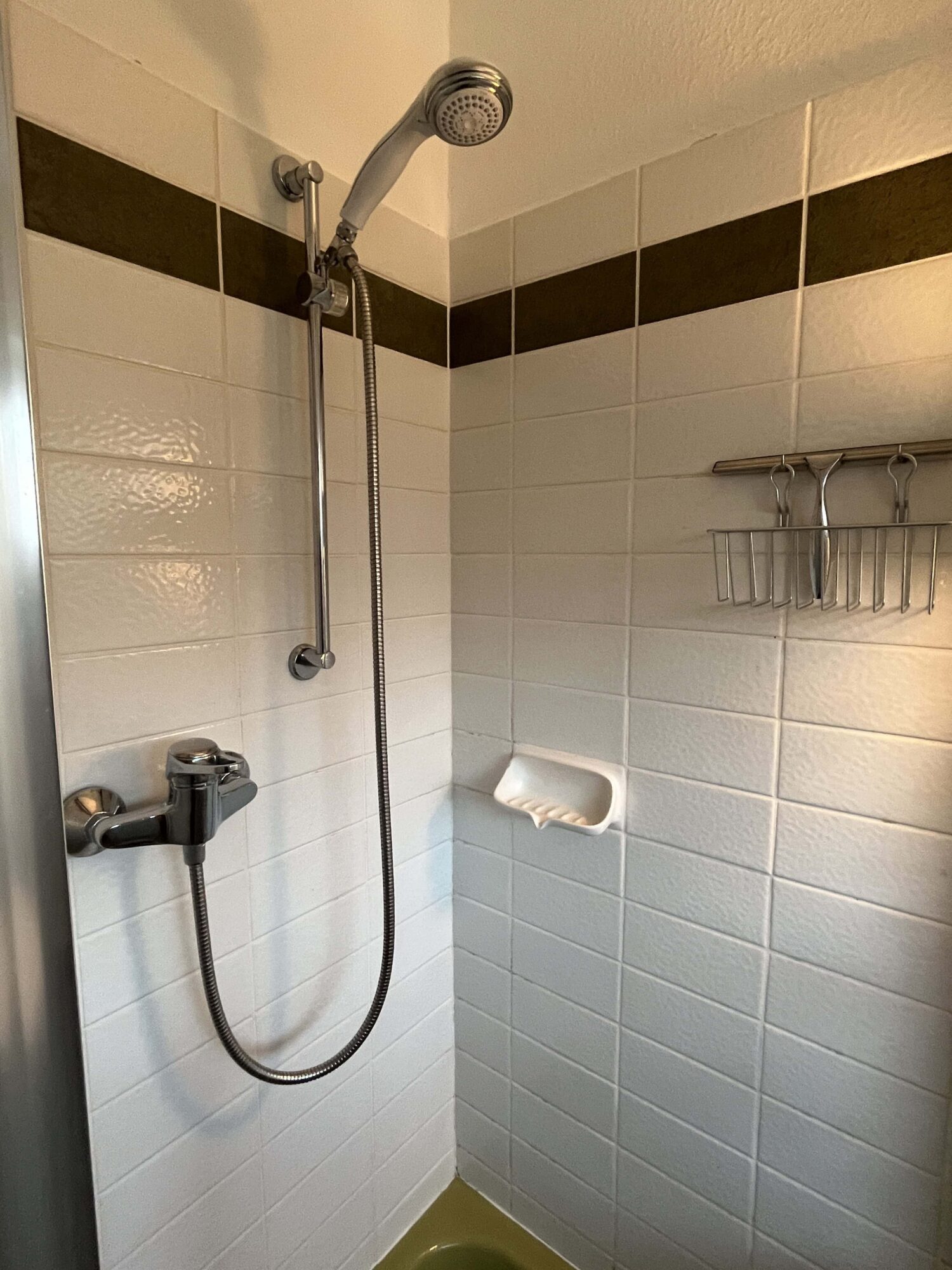 Die offene Küche ist funktional ausgestattet und ermöglicht eine unkomplizierte Selbstverpflegung. Das separate Badezimmer verfügt über eine moderne Dusche, WC und Waschbecken.