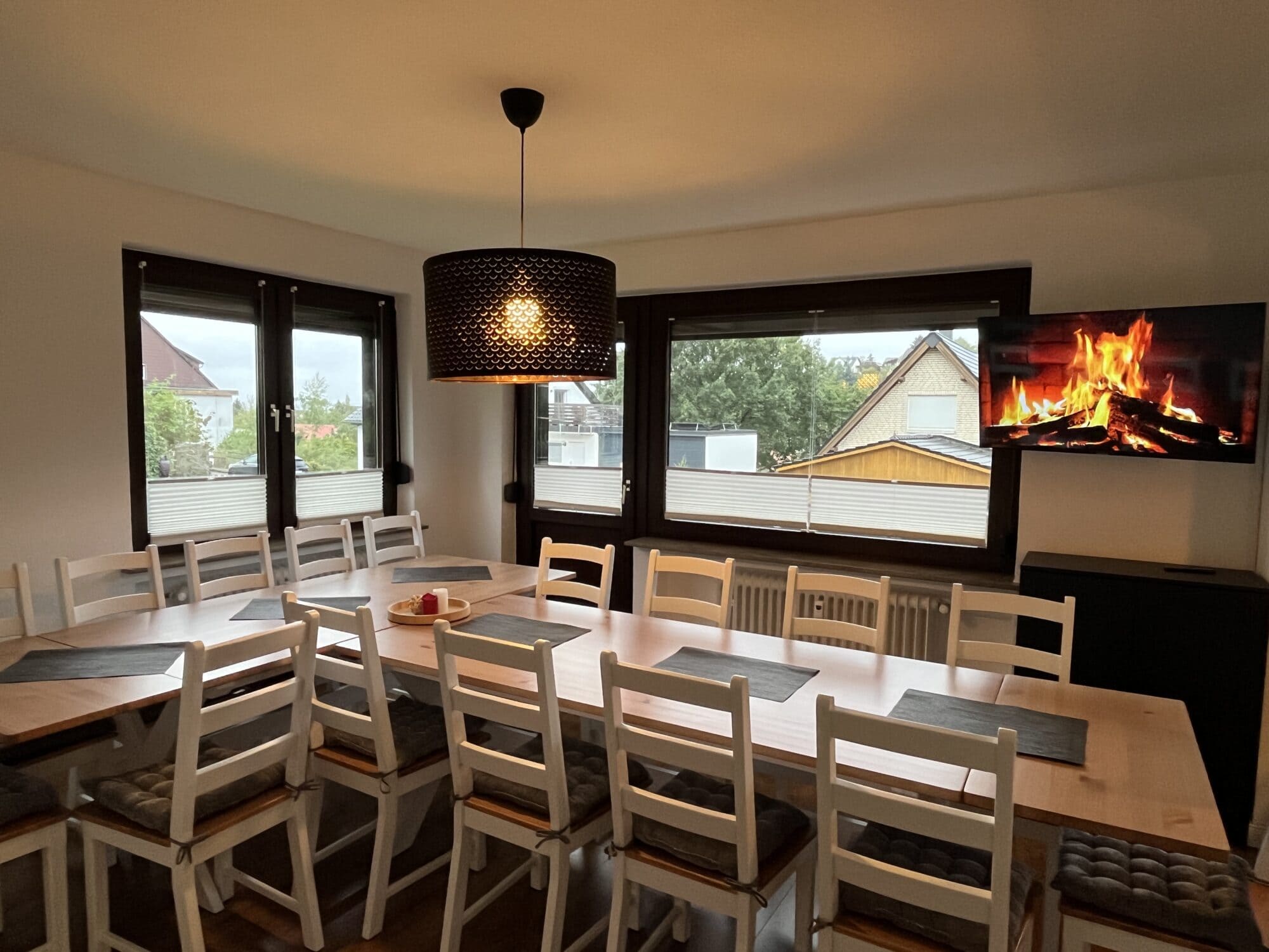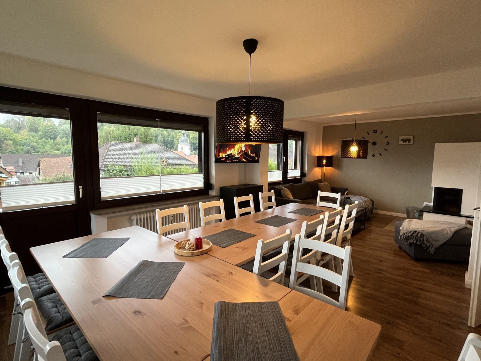 Der gemütliche Essbereich mit Kamin schafft eine warme, einladende Atmosphäre – perfekt für gemeinsame Abende nach einem aktiven Tag in der Natur. Die vollständig eingezäunte Gartenanlage mit Terrasse, Sommermöbeln und Holzkohlegrill lädt bei gutem Wetter zum Verweilen im Freien ein. Mehrere Balkone bieten zusätzliche private Rückzugsorte mit Ausblick.