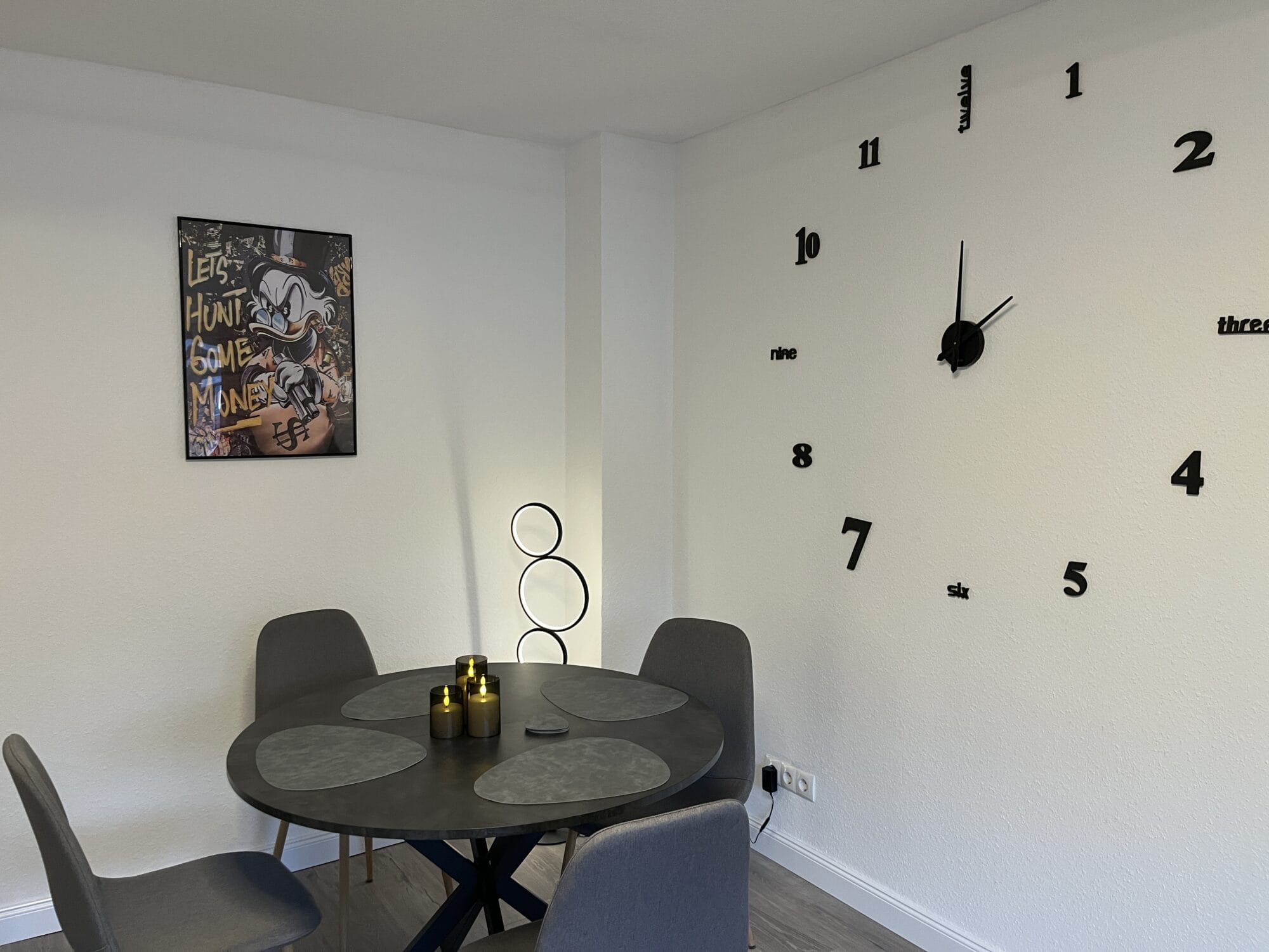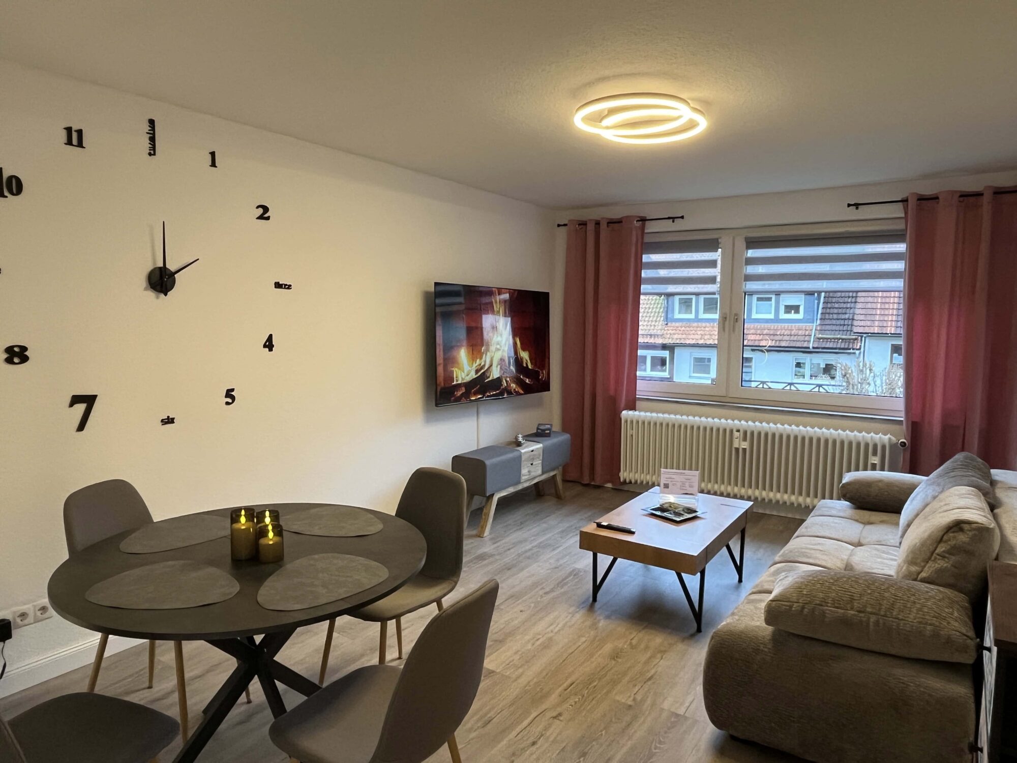 Der helle Wohn- und Essbereich lädt mit einem gemütlichen Sofa, einem Esstisch mit bequemen Sitzgelegenheiten sowie einem Smart-TV zu entspannten Stunden nach erlebnisreichen Tagen ein.