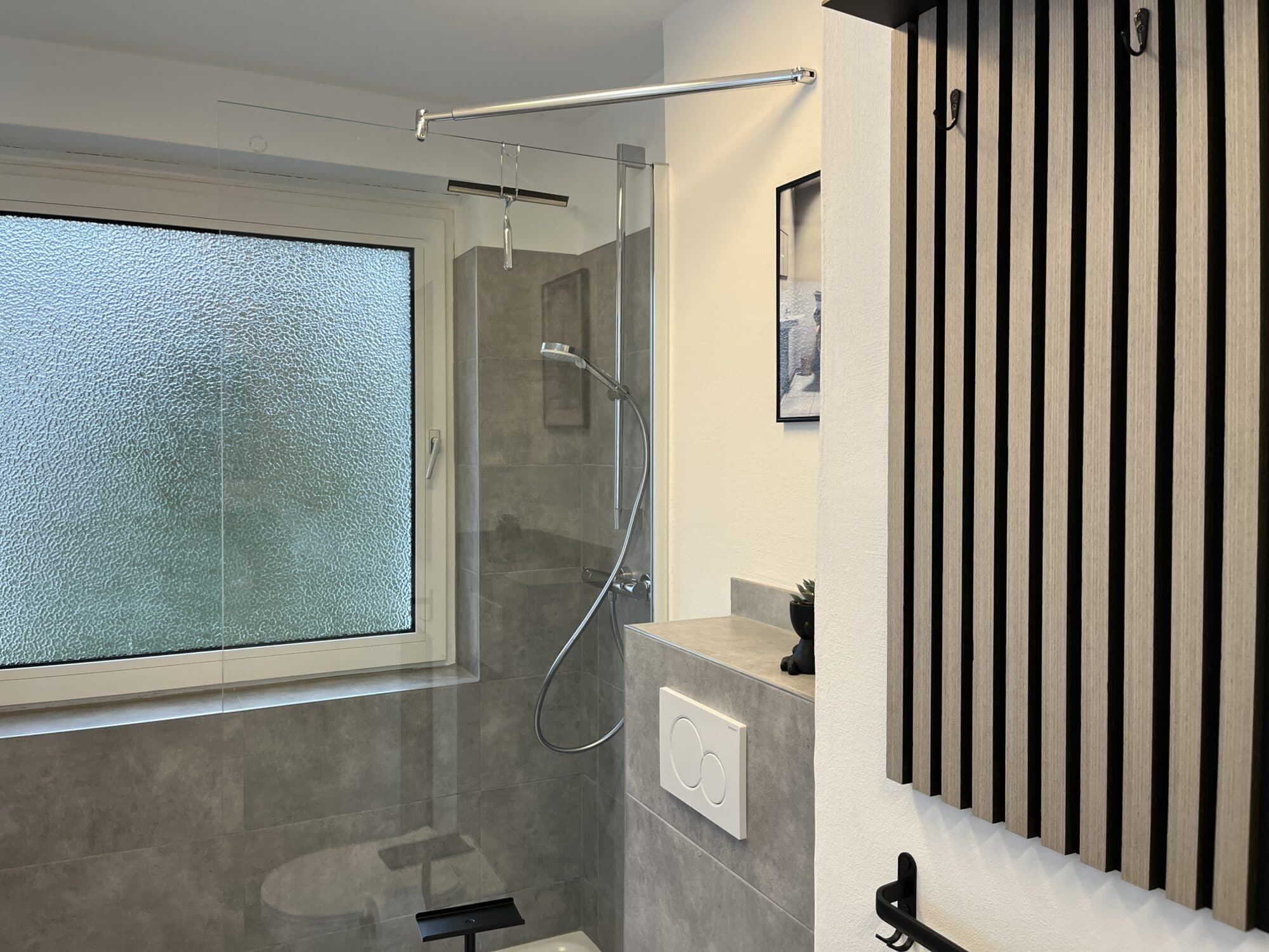 Im gepflegten Badezimmer stehen Dusche, Waschbecken, WC zur Verfügung.
