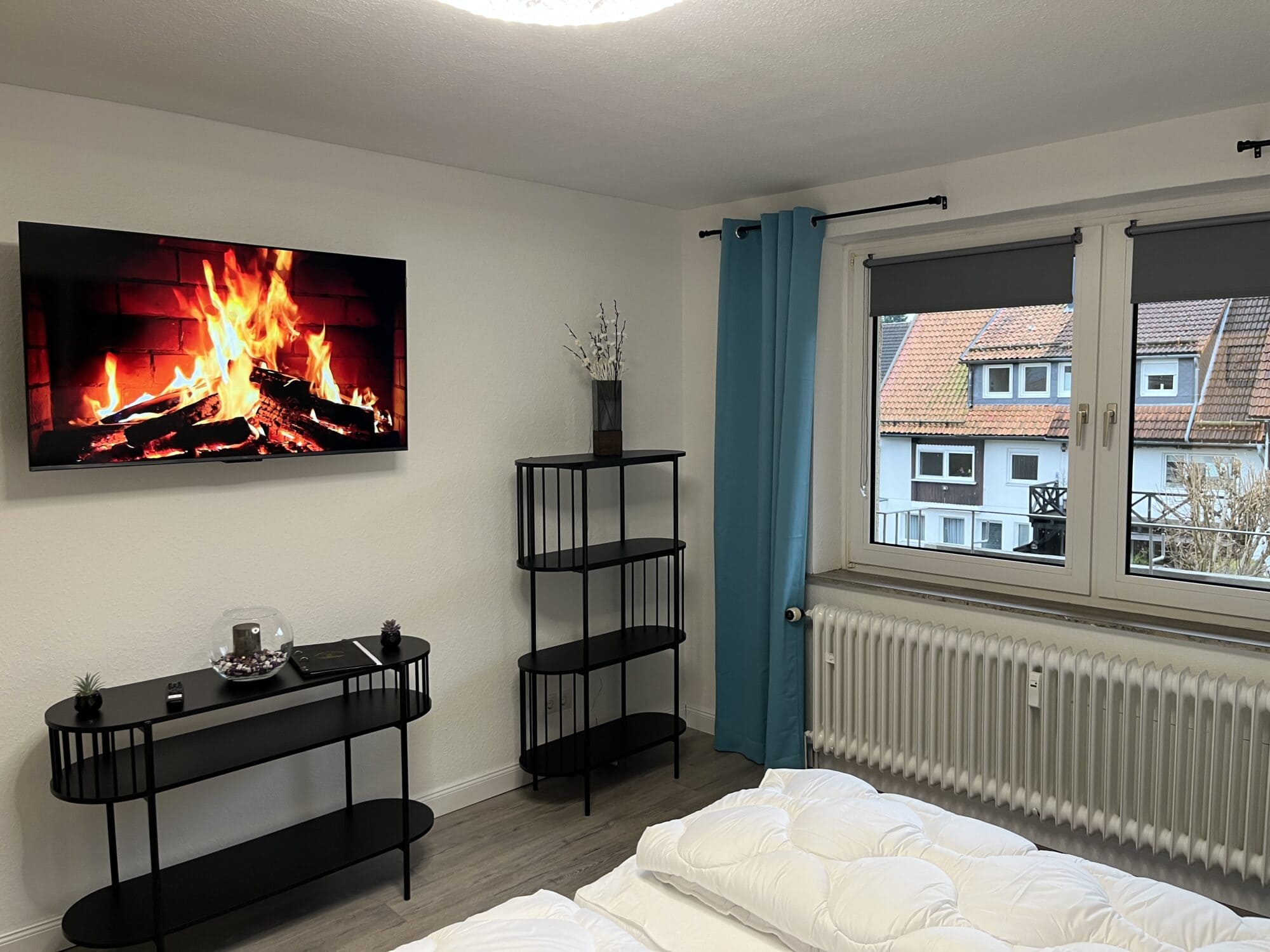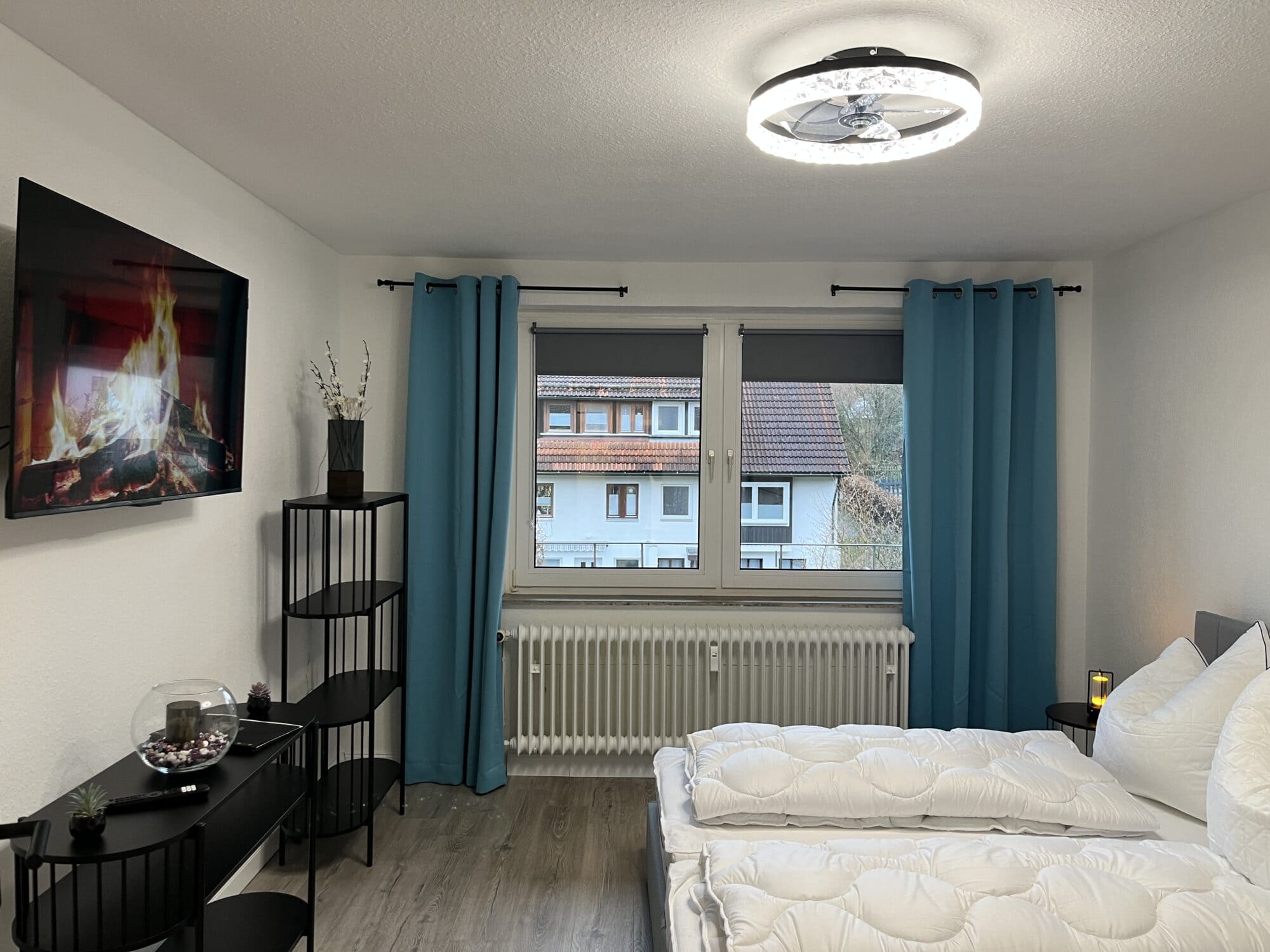 Im separaten Schlafzimmer sorgt ein großzügiges Doppelbett zusammen mit einem zusätzlichen Smart-TV für hohen Komfort.