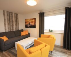 Mit bis zu acht Personen finden Sie in der Ferienwohnung Hexenbaude bequem Platz. Für gemeinsame Stunden in versammelter Runde steht Ihnen ein geräumiger Wohn- und Essbereich mit einem eleganten Esstisch für acht Personen zur Verfügung. Machen Sie es sich auf den stilvollen Sofa-Möbeln gemütlich und genießen Sie ein nettes Beisammensitzen. Ein Fernseher steht für die Unterhaltung am Abend natürlich für Sie bereit. Nähert sich ein langer Tag dem Ende, haben Sie die Möglichkeit, den Wohnraum vom Essbereich mit einer Falttür abzutrennen und so einen separaten Schlafbereich entstehen zu lassen. Das Sofa lässt sich schnell in eine Schlafcouch umfunktionieren.