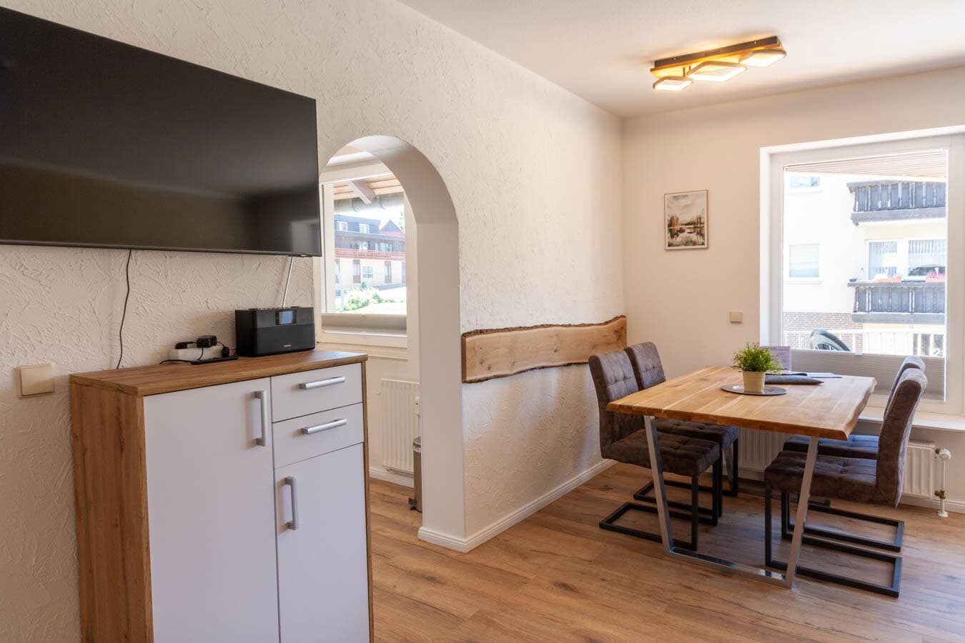 Zentral gelegen und nur wenige Schritte vom Kurpark entfernt, vereint diese Ferienwohnung in Braunlage modernen Wohnkomfort mit der Nähe zur Natur des Harzes. Zwei separate Schlafzimmer bieten ausreichend Platz und Rückzugsmöglichkeiten – ideal für Familien oder kleine Reisegruppen. Der offen gestaltete Wohn- und Essbereich mit integrierter Küche schafft ein harmonisches Ambiente zum Entspannen, Kochen und gemeinsamen Verweilen.